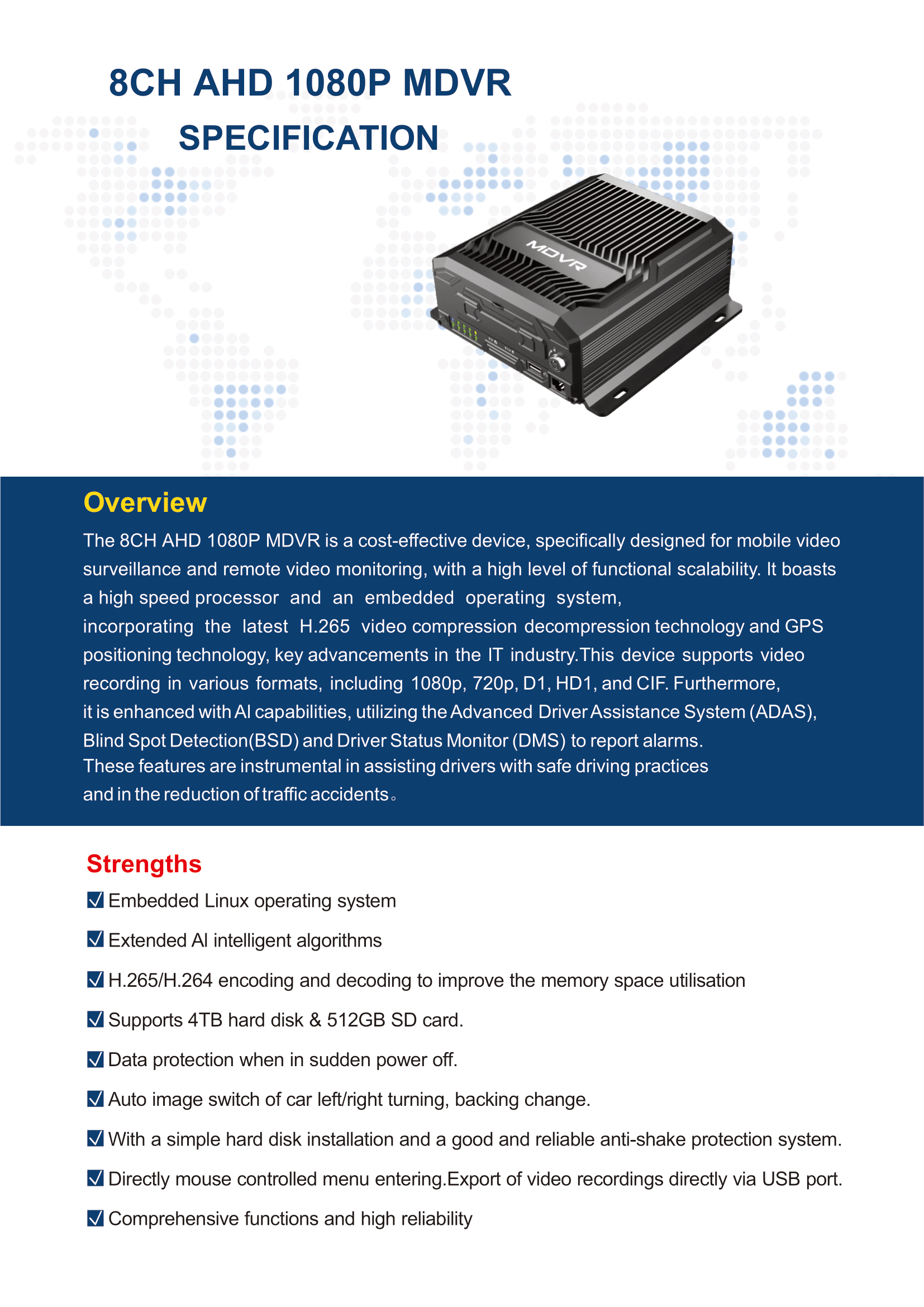 El 8CH AHD 1080P MDVR es un dispositivo económico y de alto rendimiento, diseñado específicamente para la vigilancia y monitoreo remoto de vehículos. Equipado con un sistema operativo Linux y un procesador de alta velocidad, este dispositivo admite cámaras de video AHD de 1080P y 720P, así como cámaras IP. Ideal para soluciones de videovigilancia en flotas de vehículos y aplicaciones móviles.